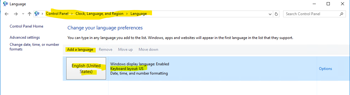 As displayed in the screenshot, you need to add a language English united states under controlpanel -> clock, language and region -> language